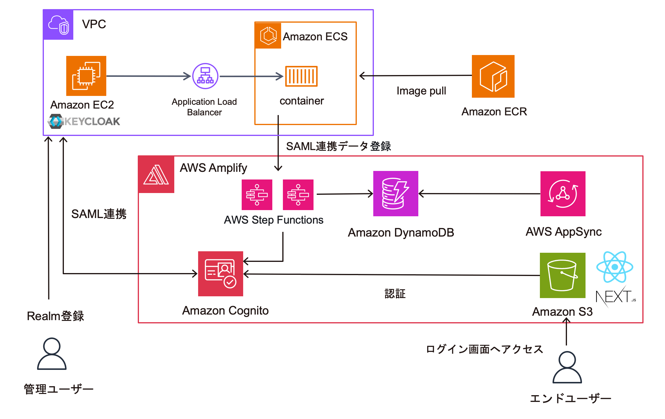 人数カウントソリューション(クラウド型サブスクリプションサービスとして提供中)に導入済みの※Keycloakを活用したSAML認証によるシングルサインオンについて、運用をサーバーレス(AWS)に移行するためのPoCを実施。