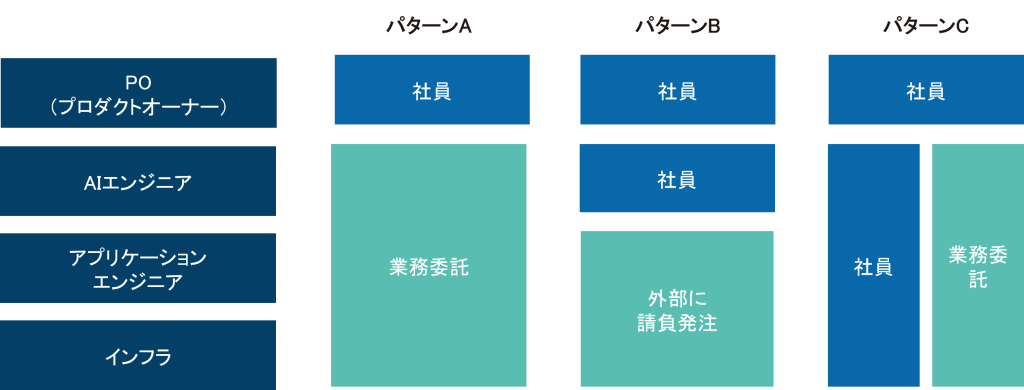 - パターンB:AI部分は社員、Web/インフラは外部:変化の激しいAI部分は柔軟に対応できるよう社員が担当し、比較的変化の少ない画面周りやインフラは外部が担当(または請負での外部委託)します。