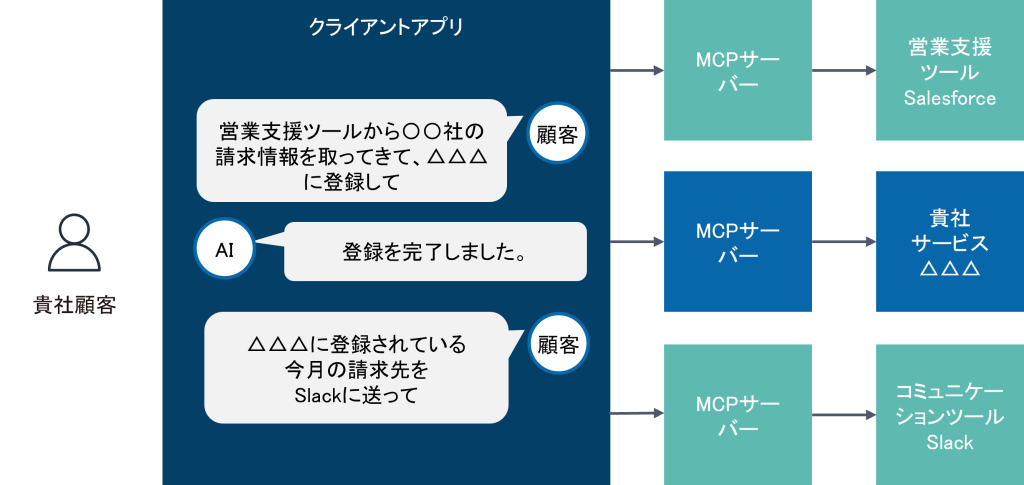 例えば、BtoBサービスを持っている企業がそのサービスをMCPに対応させた場合、SalesforceやSlack等、他のMCP対応ツールと生成AIを通じた連携が容易に(個別のプログラム開発なしに)できます。