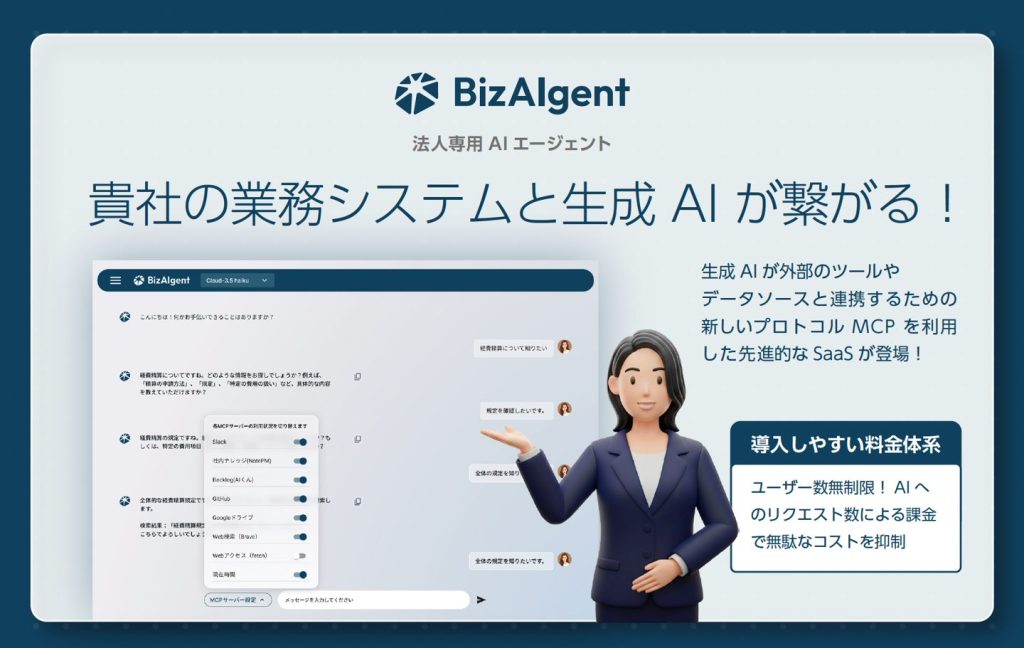 BizAIgentは前述のMCPに対応したAIエージェントであり、企業の業務システムと生成AIを安全かつ柔軟に接続します。ユーザーがチャット画面から指示を入力すると、裏側で複数のシステムと連携し、必要な処理を自動的に実行します。
