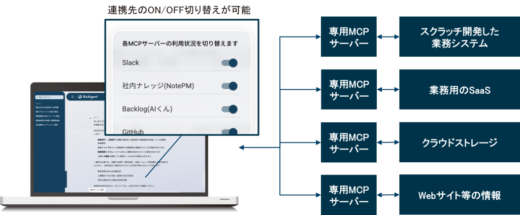 外部データとAIを接続する標準プロトコルであるMCPを通じて、社内システムやストレージに蓄積されたデータと連携します。