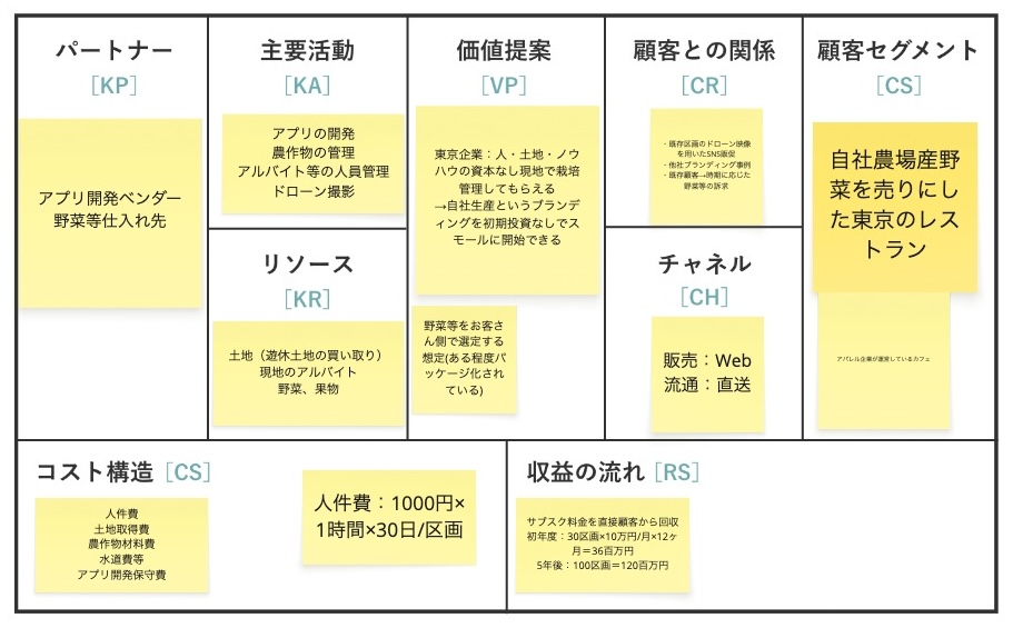 社内研修で作成されたBMCの一例では、顧客を「東京のレストラン」と設定。野菜や果物の栽培代行サービスをサブスクリプションモデルで提供するすBtoBの事業として提案しました。