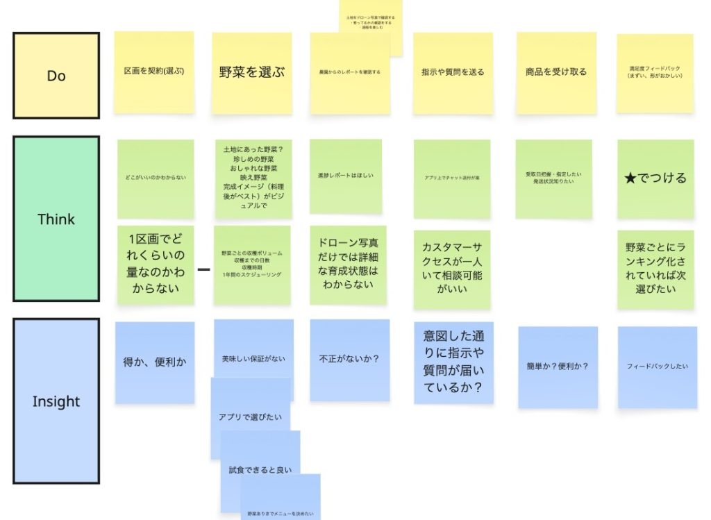 この研修では、CJMを用いて顧客の行動(Do)・思考(Think)・本音(Insight)を整理する過程で、顧客が「どの野菜を選べばいいか分からない」「写真だけでは育成状況が不明」といった不安や不満を持つ可能性が発見されました。