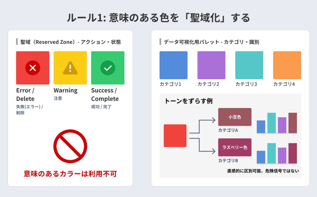 ユーザーのアクションを促す「赤(Error/Delete)」「緑(Success/Complete)」「黄(Warning)」の3色は、システム上の聖域(Reserved Zone)として定義します。