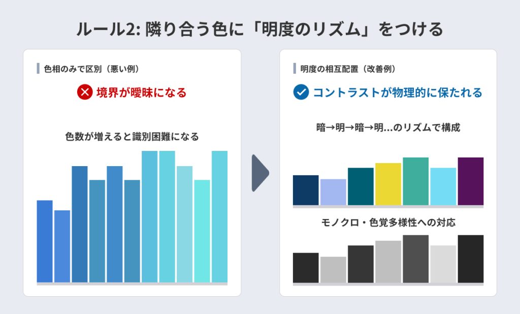 このルールを適用すれば、たとえ色覚多様性を持つユーザーや、モノクロ印刷された資料であっても、グラフの境界線(コントラスト)が物理的に保たれます。
