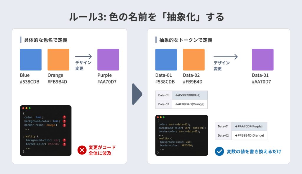 最後のルールは、運用と拡張性のためのものです。カラーパレットを開発者に渡す際、 Blue や Orange と名付けず、これらは Data-01, Data-02……といった「順序付きのトークン」として定義します。