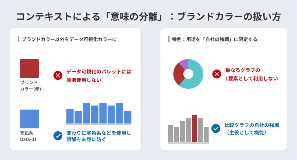 - 原則: データ可視化パレットにおいて、ブランドカラー(赤)の使用を禁止する。代わりに寒色系の「Data-01(青やティールなど)」を使用し、誤解を未然に防ぐ。