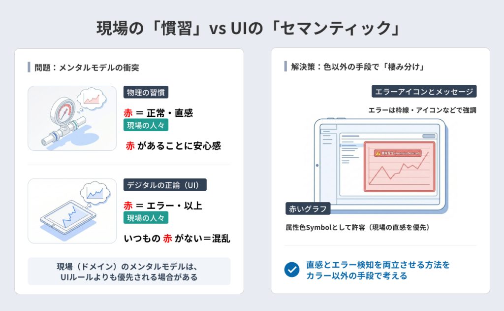 ある産業機器の管理システムの事例です。現場の計器では、ある重要な数値が伝統的に「赤色のグラフ」で表示されていました。 しかし、Webアプリ化する際、デザイナーは「赤はエラー色だから」というUIの正論に基づき、これを青色のグラフに変更しました。