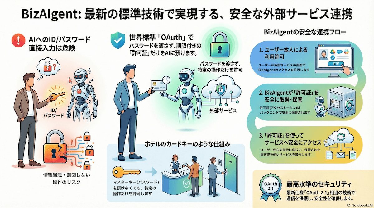 そこでBizAIgentでは、「OAuth(オーオース)」という世界標準の技術を採用しています。