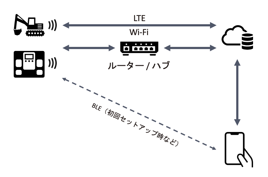 本構成では、デバイスデータは主にインターネット経由で直接クラウドへアップロードするため、遠隔操作やデータの一元管理ができることが特長です。なお、スマート家電などでは「初期設定(Wi-Fiパスワードの転送等)時のみBLEで接続し、通常運用はWi-Fiで行う」というハイブリッド構成が一般的です。