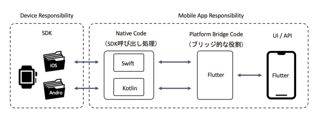 上図は、モバイルアプリの画面作成やAPI通信部分など大部分をクロスプラットフォームで作成し、SDKを呼び出す処理部分だけ各OSネイティブ言語で実装、それらを共通の処理で呼び出す構成になっています。こうした構成は、部分的にネイティブコードを実装する必要はありますが、異なるアプリを2つ別々に制作するより開発・保守費用を抑えられます。