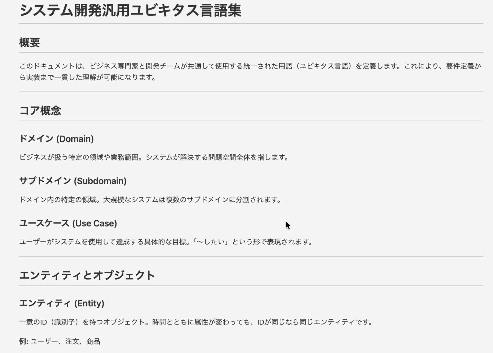 ユビキタス言語集とはビジネスサイド(POやステークホルダー)と開発チーム、あるいはチームメンバー間で、特定の用語を「同じ意味」で扱えるように定義した辞書のようなものです。