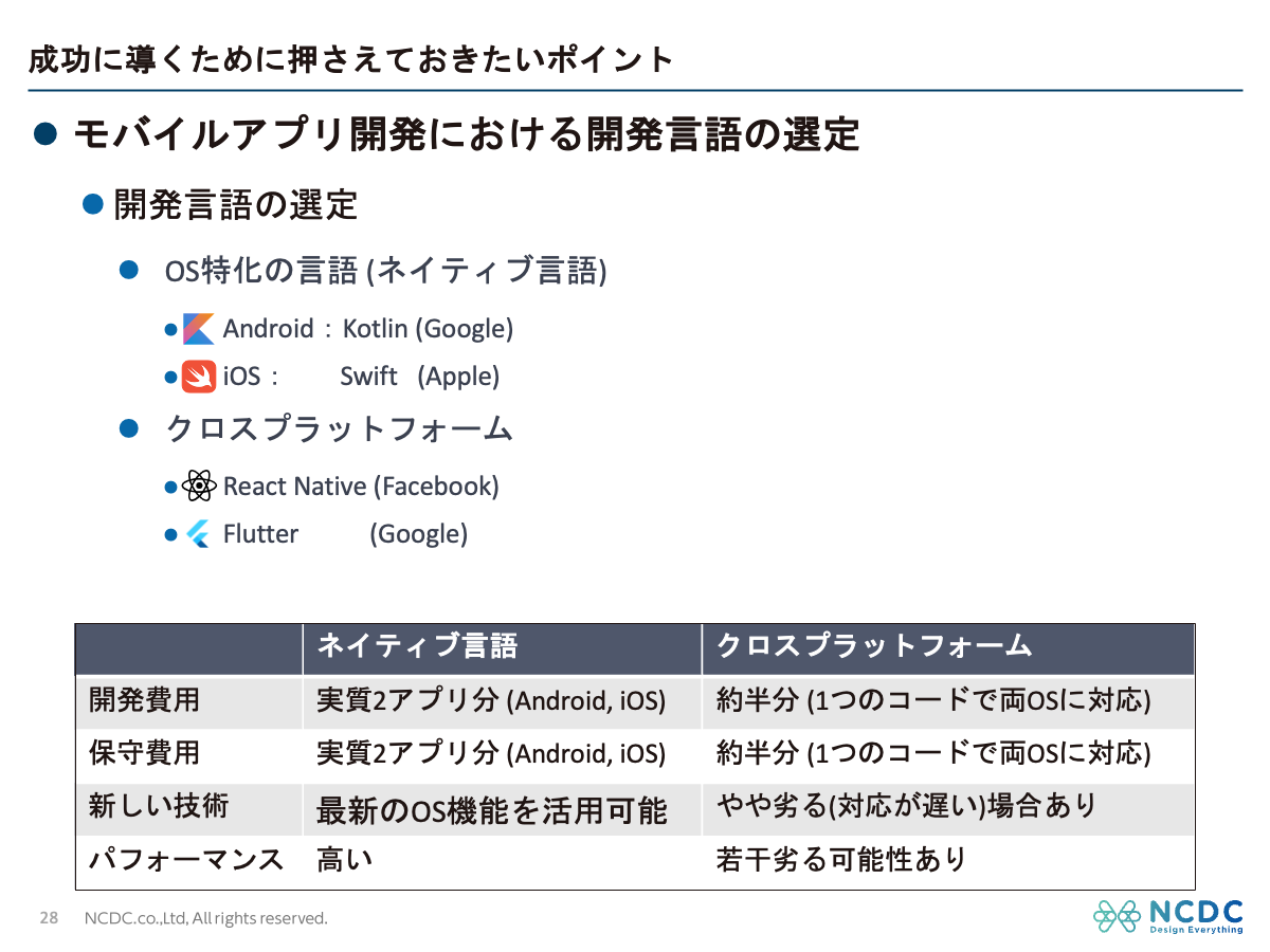 ネイティブ言語での開発、クロスプラットフォームでの開発、どちらが良いかはアプリの要件や目的に応じて最適な選択を検討する必要があります。