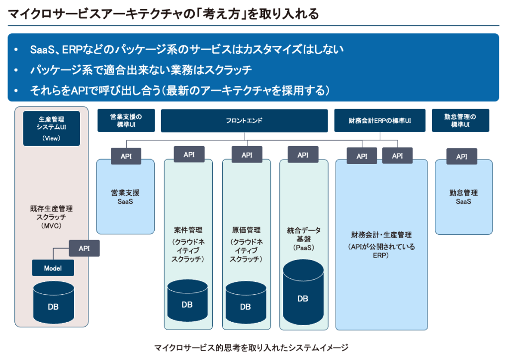 マイクロサービスアーキテクチャは、巨大なシステムを一つのアーキテクチャで構築せず、小さな単位に分割しAPIで連携する考え方です。この手法により、業務プロセスに応じた最適なツールやプラットフォームを柔軟に選べます。例えば、財務会計や生産管理にはERP、勤怠管理や営業支援にはSaaSソリューション、原価管理はスクラッチ開発といった選択をすることで、効率的なシステム構築が可能になります。