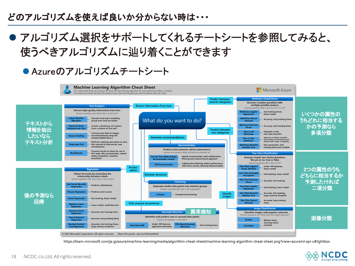 また、Microsoft Azure Machine Learningのチートシートでは、 「何をしたいか(分類・回帰・テキスト分析など)」から最適な手法を導く ことができます。