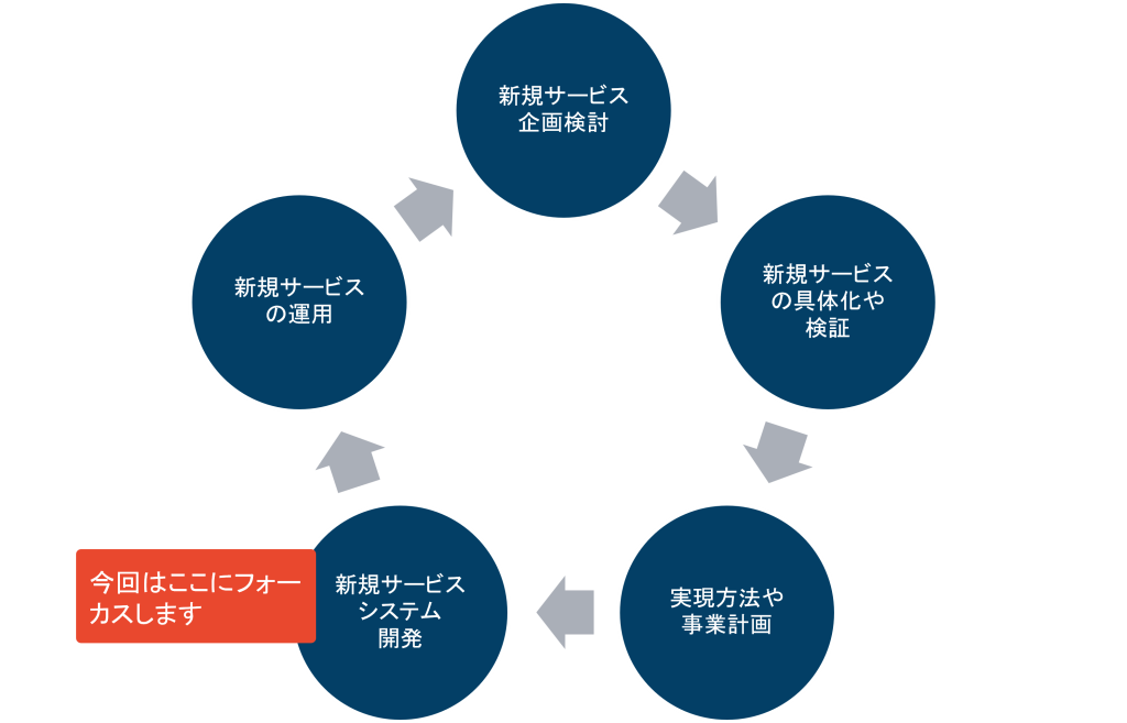 新規サービスの発案から展開までの流れ を下図に示していますが、今回は特に左下の新規サービスのシステム開発の部分に焦点を当てて解説します。