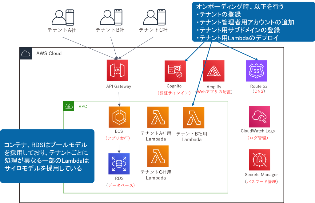 そのため、新しいテナントが増えた場合のオンボーディングでは、データベースへのテナント登録、テナント管理者アカウントの追加、テナント用サブドメインのDNSサーバー登録、テナント用Lambdaのデプロイなどを行います。
