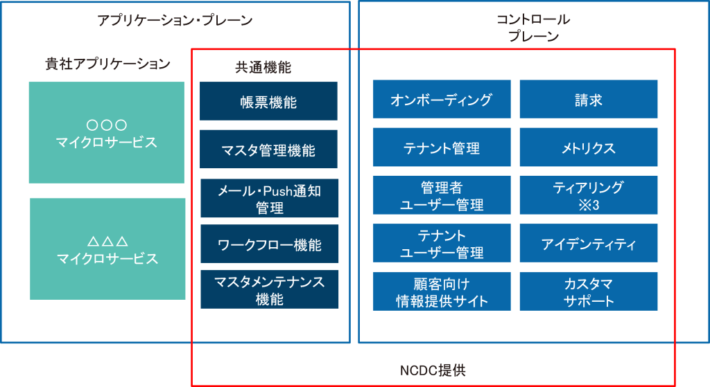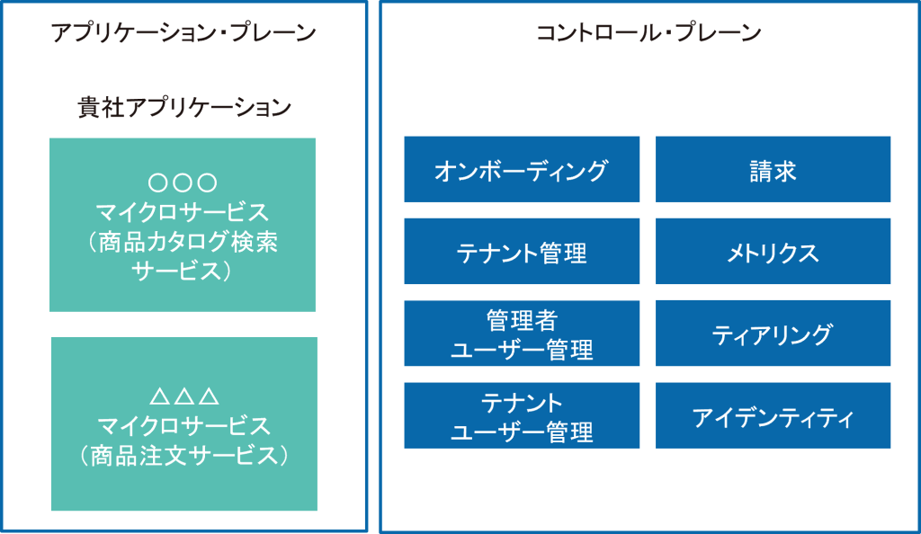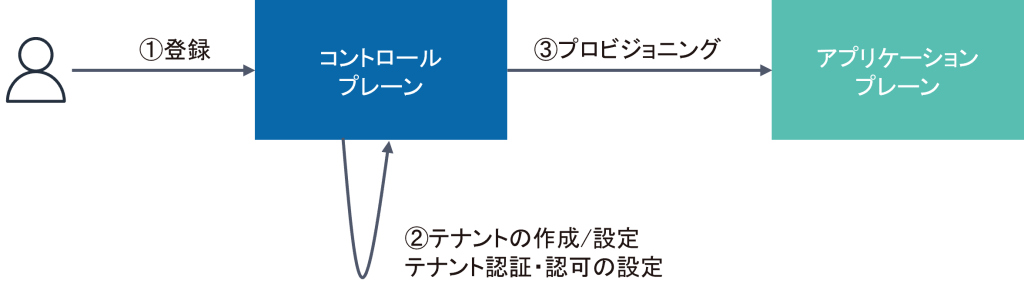 - コントロールプレーン: マルチテナントやSaaSで共通的に必要となる機能(テナント管理、認証など)を持つ部分です。