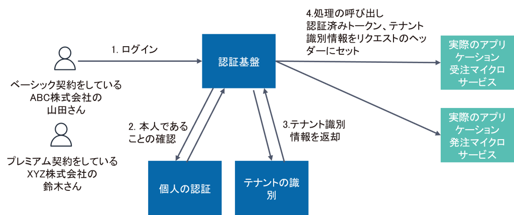 例えば、A株式会社の山田さんとB会社の鈴木さんがログインした場合、それぞれの本人認証はもちろん行いますが、テナント識別によって山田さんがA株式会社のベーシックティアのユーザーであることをアプリケーションに渡します。