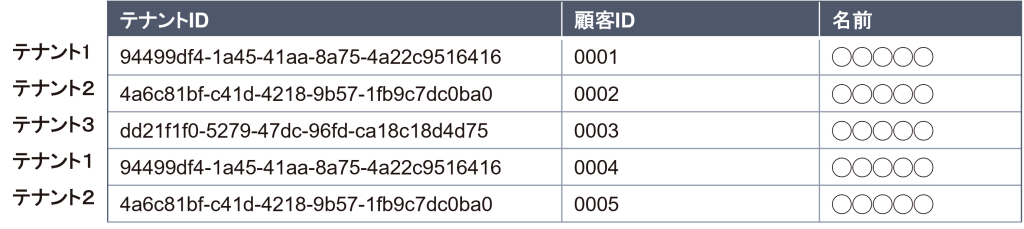 - 一つのテーブル内に複数のテナントのデータを管理する