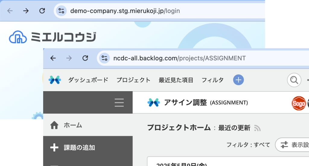 - 例:「mierukoji.jp」や「backlog.com」のように、サービス自体のドメインの前にテナント固有の情報が入るサブドメイン形式。