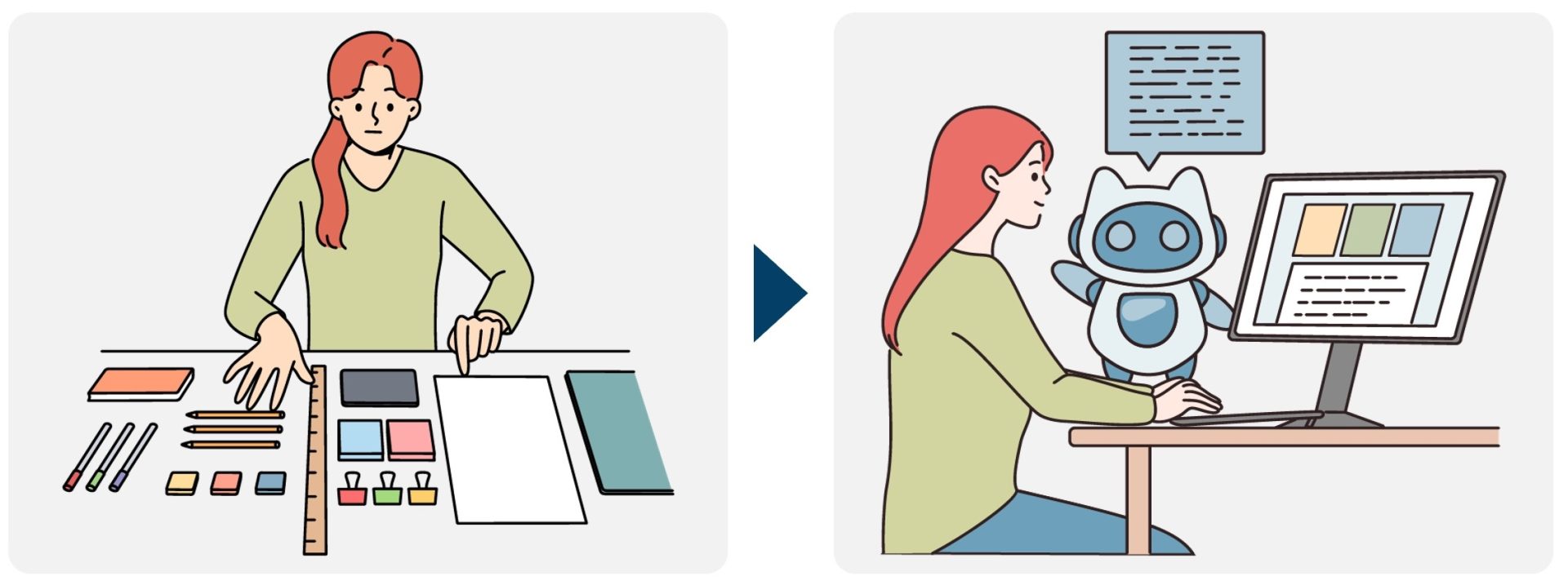 まずは、生成AIとUX/UIデザインの可能性についてです。かつて手作業だったデザイン工程は、デザインツールの登場といったソフトウェアの進化によりデジタルへ移行し、効率化されてきました。そして今日、生成AIの登場によってデザイナーの役割も変化しつつあります。