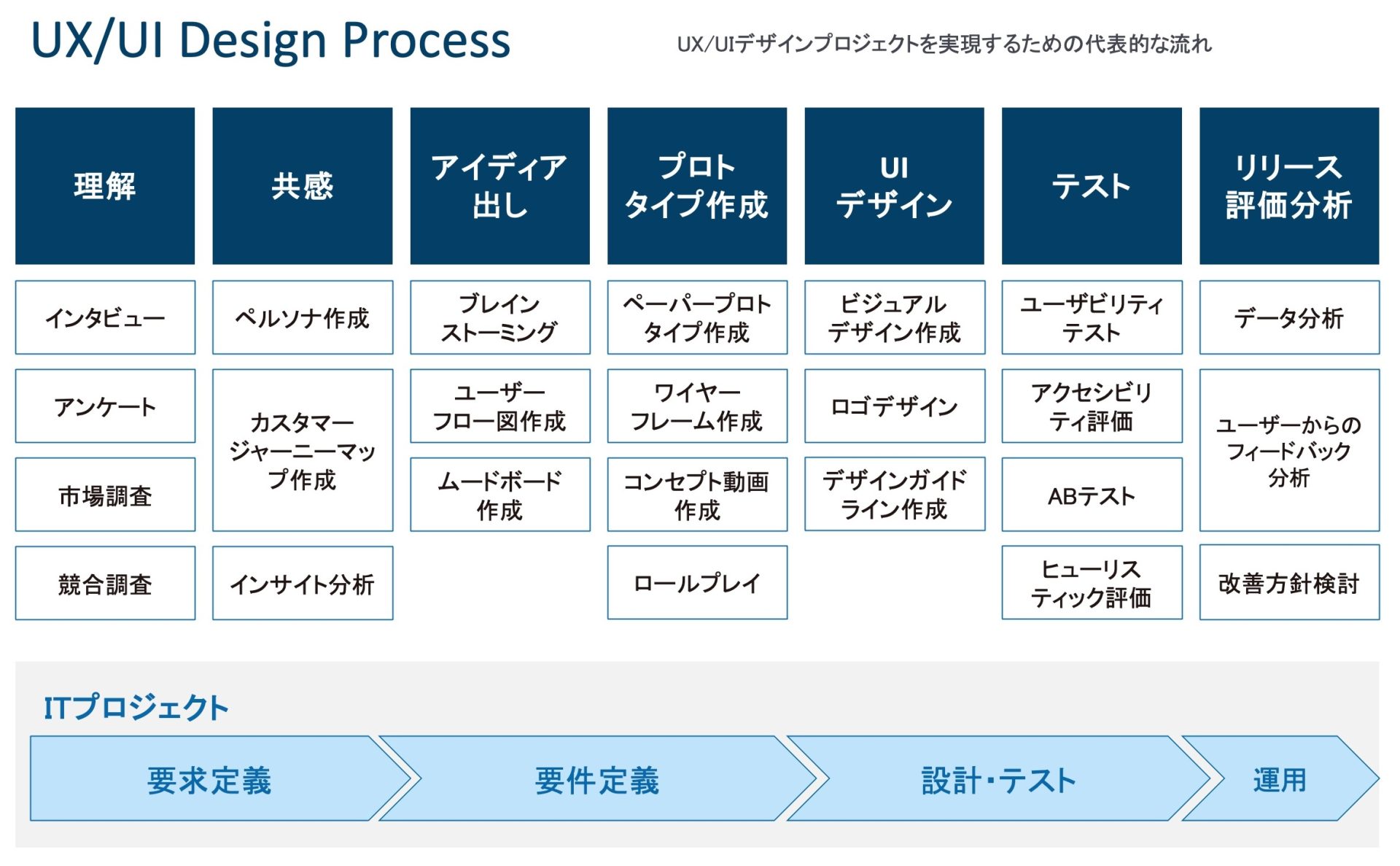 下図はUX/UIデザインの代表的なプロセスとITプロジェクトの流れを示したものです。