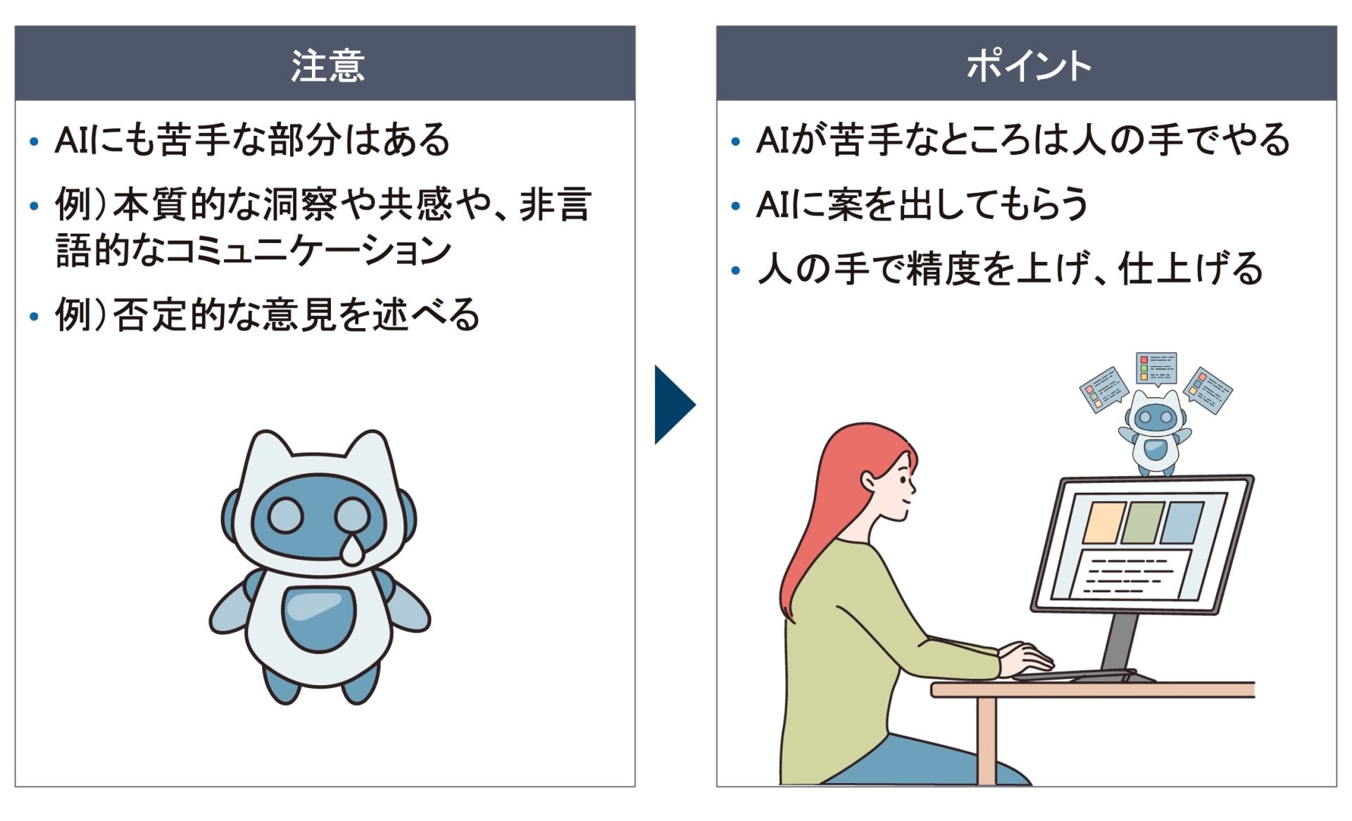 AIを上手に活用するためには、AIと人、それぞれに苦手なところがあることを理解し、AIが得意なところはAIにどんどん案を出してもらい、人の手で精度を上げていくという作業分担が重要になってきます。