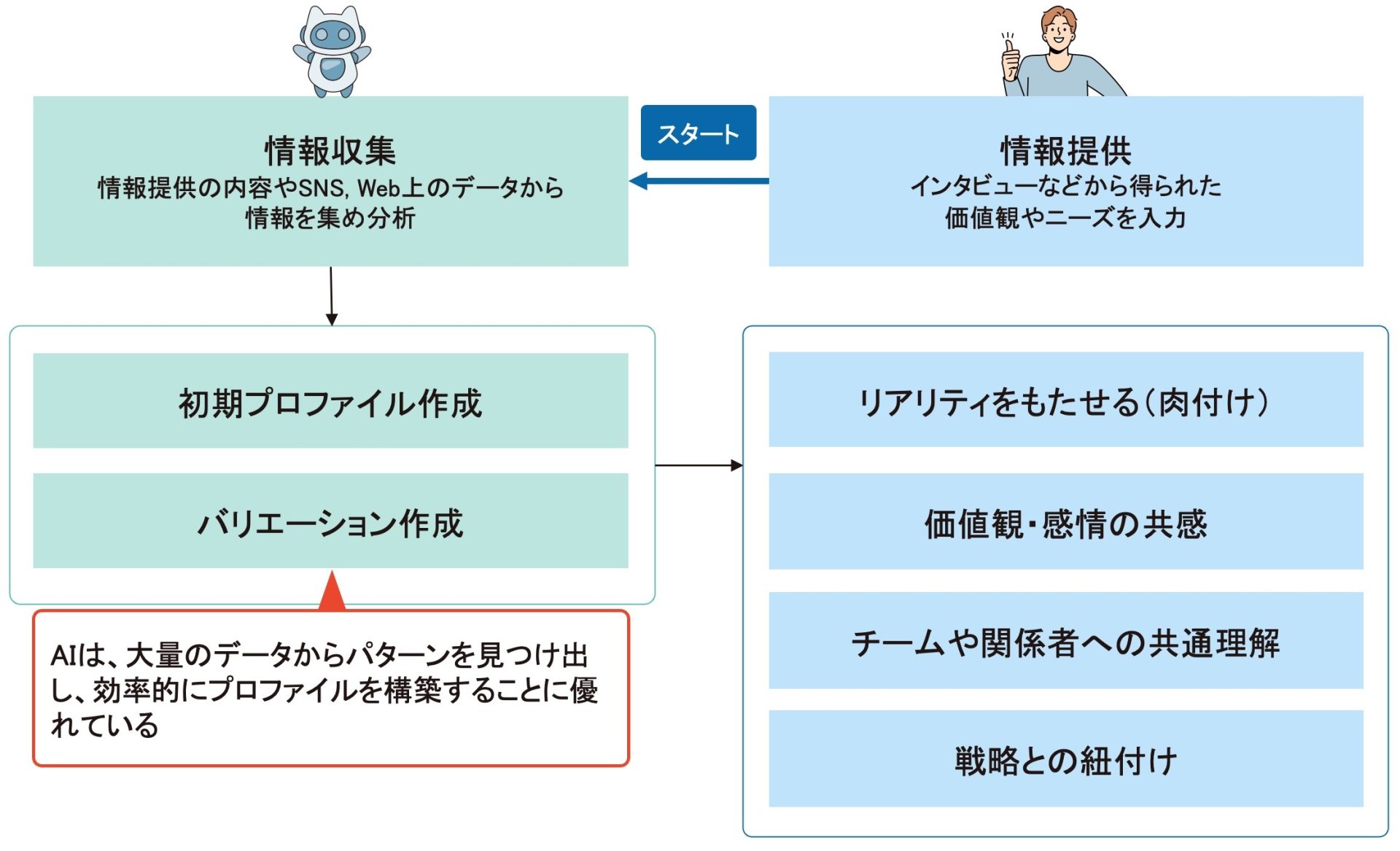 まず、ベースとなる情報は人が提供します。事前のインタビューやアンケート等で得たユーザーの生の価値観やニーズを入力データとしてAIに渡します。