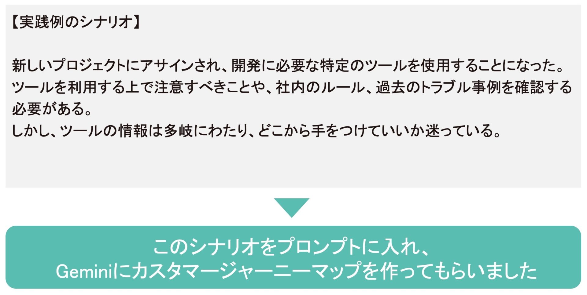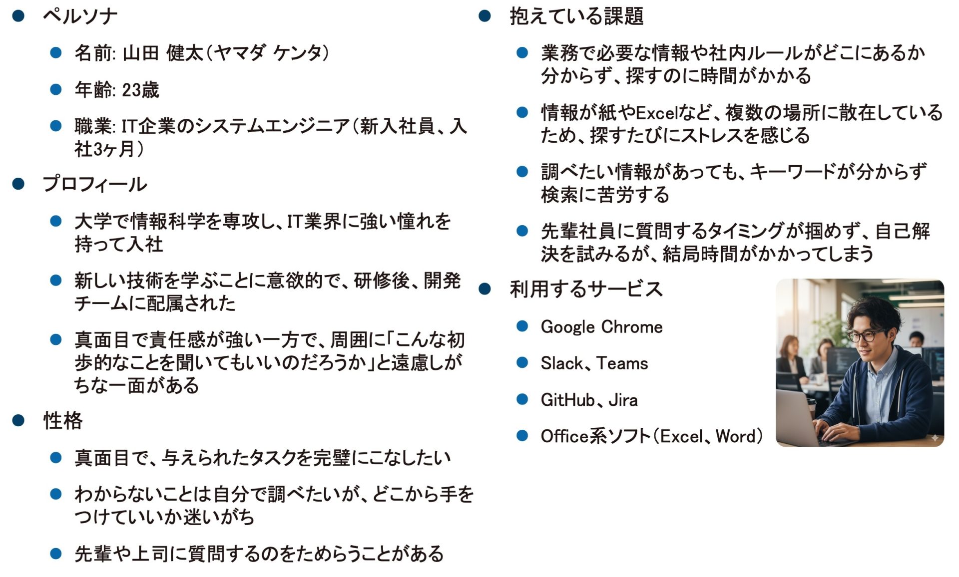 今回は、先ほど作成したペルソナの山田健太さん(新人エンジニア)に対し、以下のシナリオを与えました。