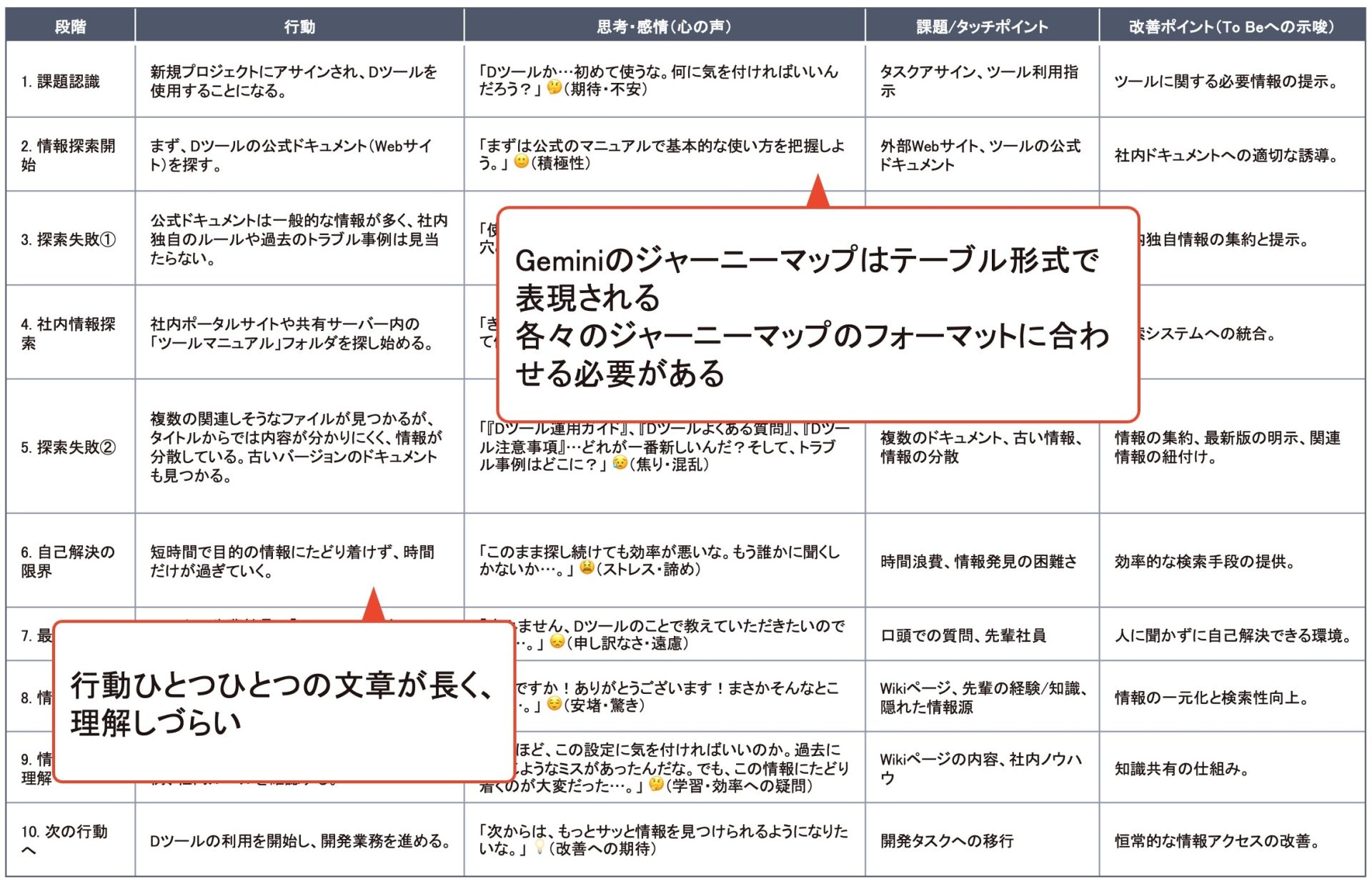 一連の流れや、その時々の基本的な感情、改善施策のアイデアまでしっかり記述されています。ゼロから書き出す手間を考えると、これだけでもかなりの時短になります。