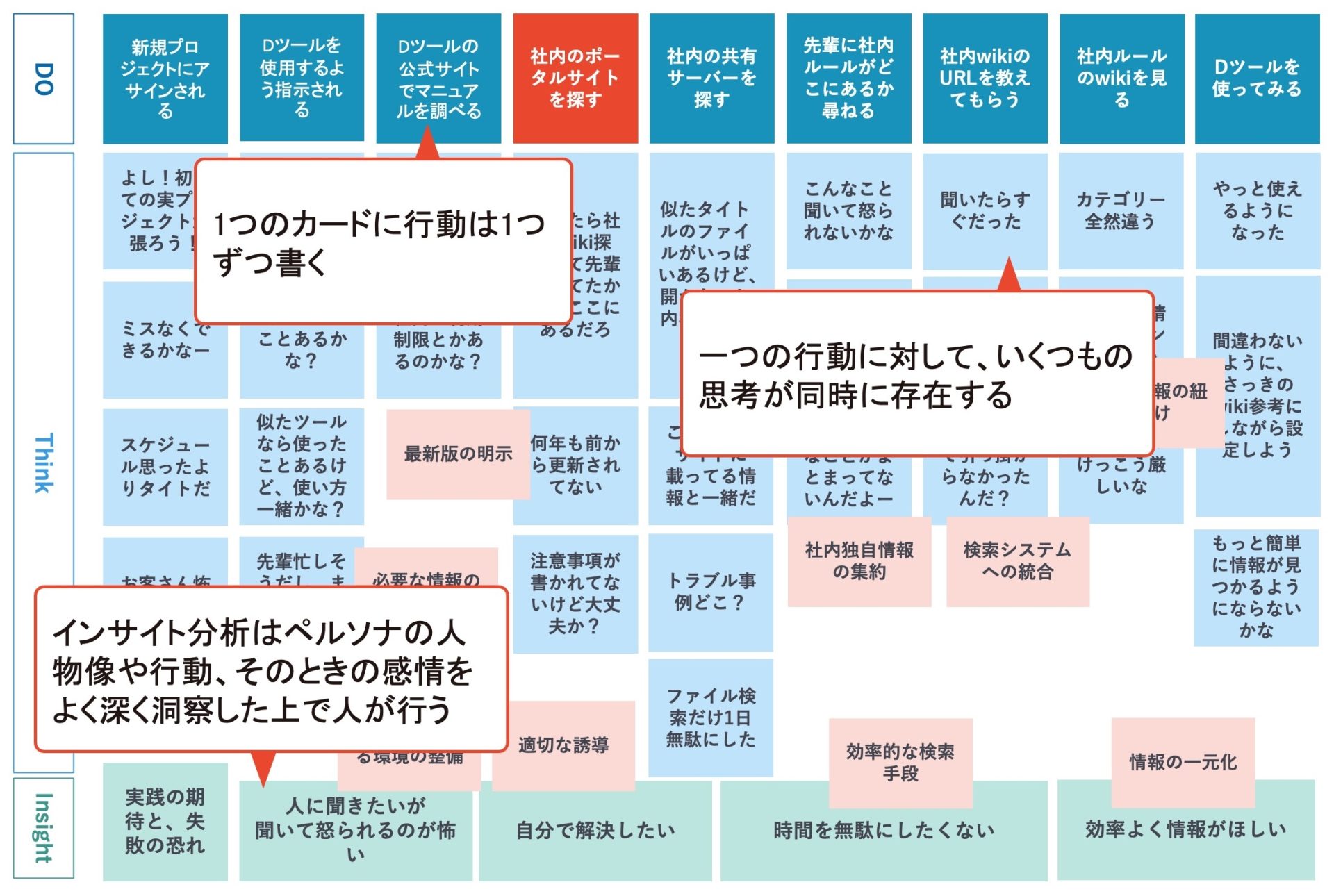 ② 思考の多層化:AIは「行動Aに対して思考B」と1対1にしがちですが、人間の感情はもっと複雑です。1つの行動に対し、ポジティブとネガティブが同居していることもあります。そうした微細な思考を複数の付箋で追加していきます。