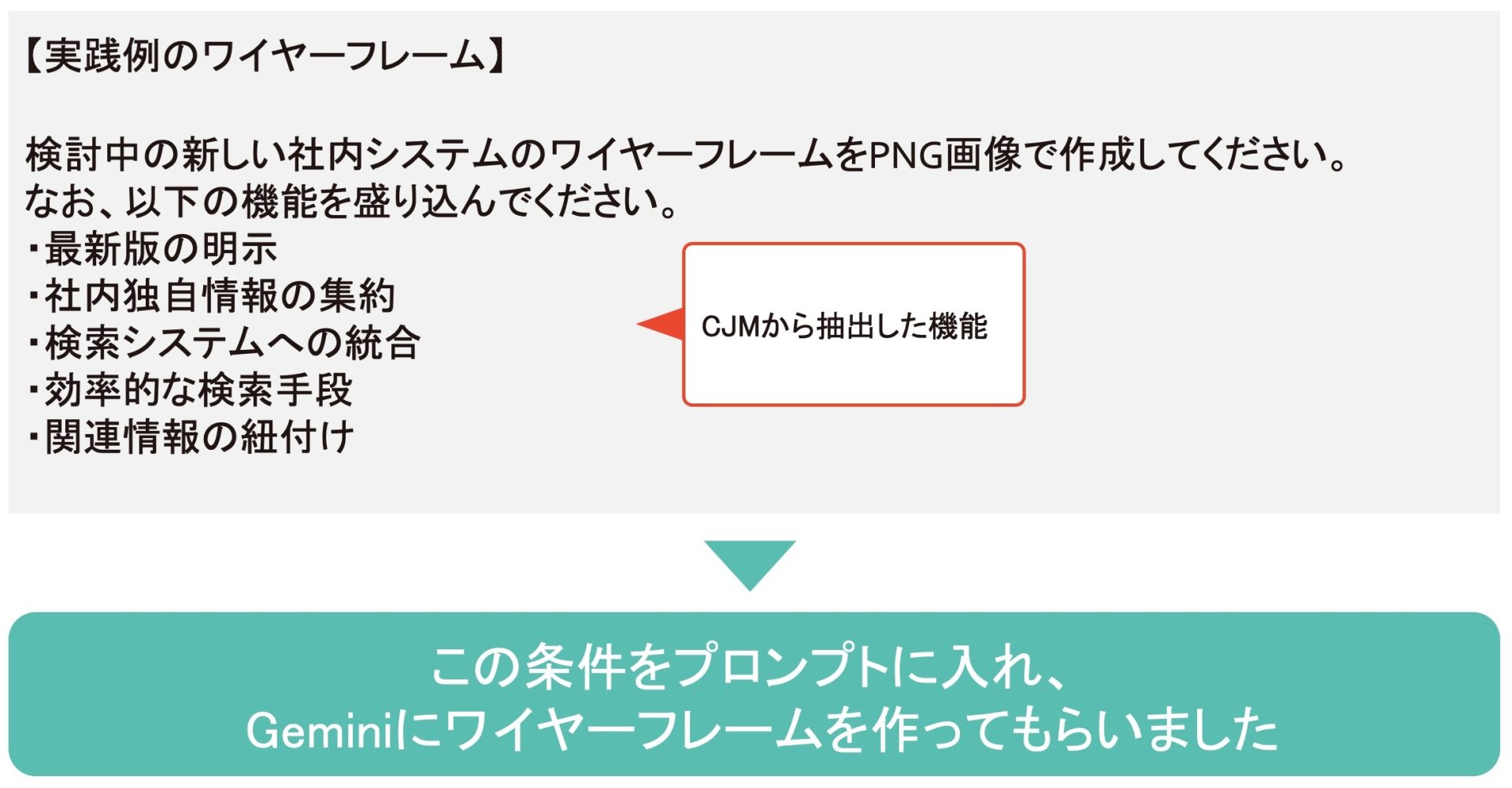 これまでの流れと同様にGeminiに対して「社内ドキュメント検索システムのワイヤーフレーム画像を作って」と依頼してみました。