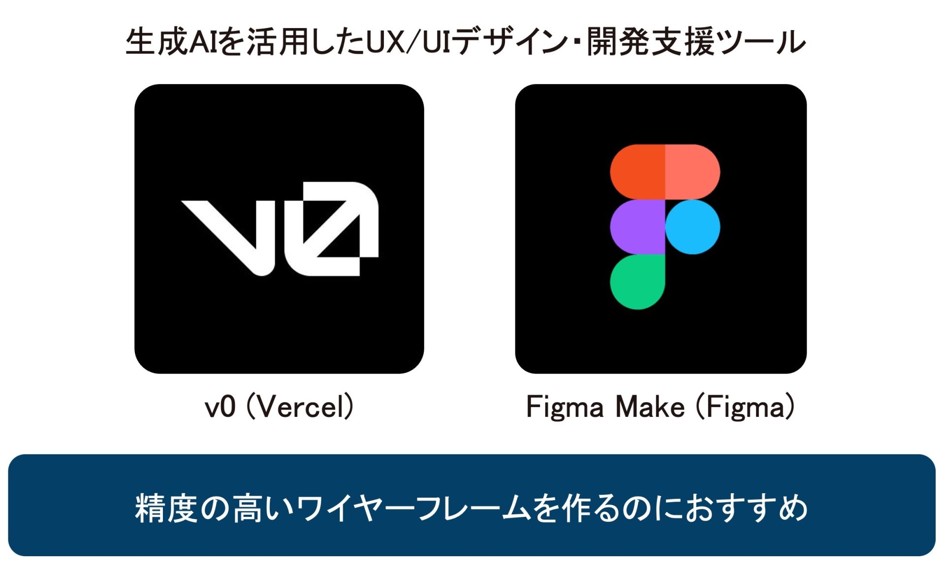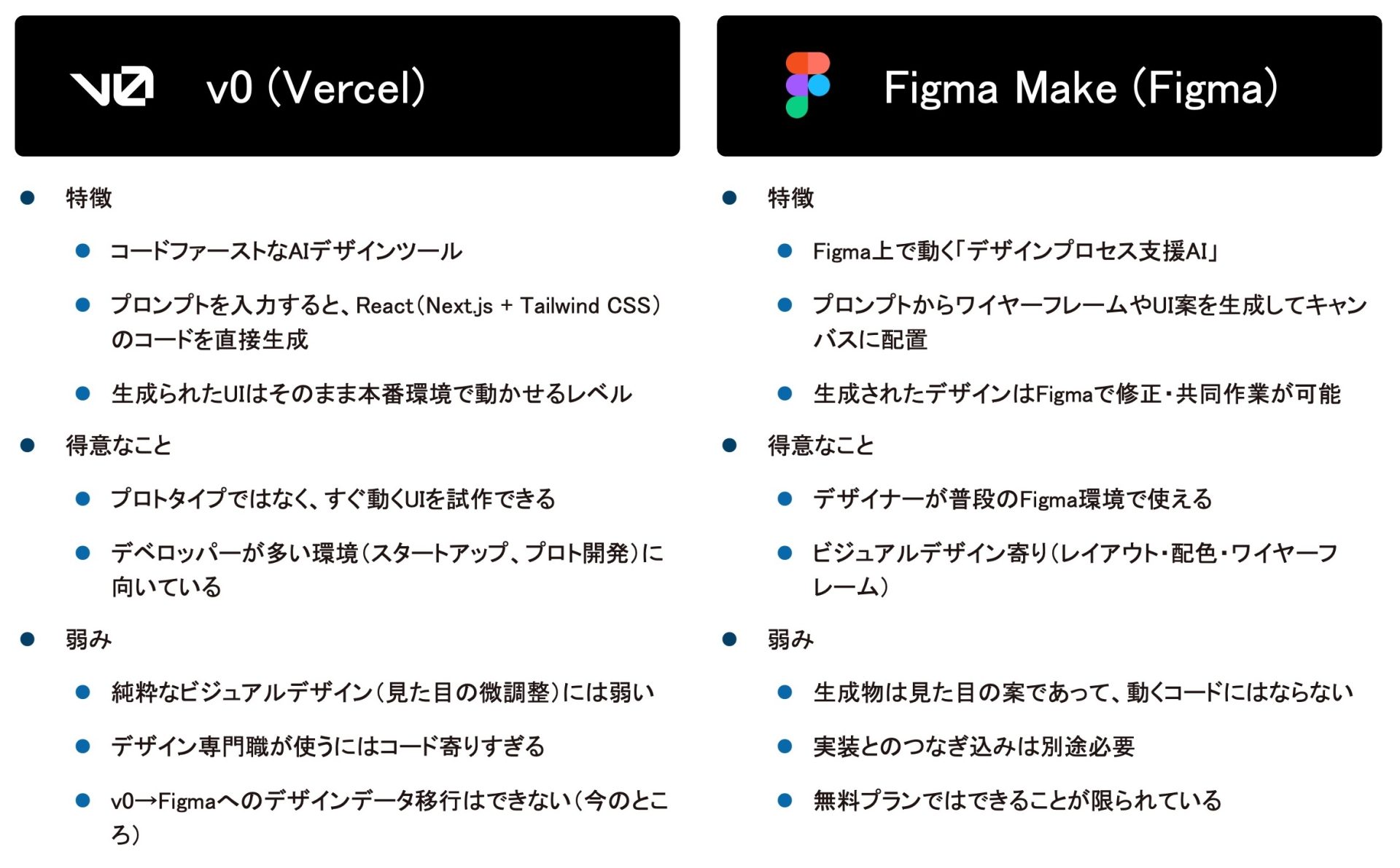 現在おすすめできる2つのUX/UIデザイン・開発支援ツールがv0 (by Vercel)とFigma Make (by Figma)です。この2つはどちらも非常に優秀ですが、開発ファーストかデザインファーストかという特徴がはっきりと分かれています。
