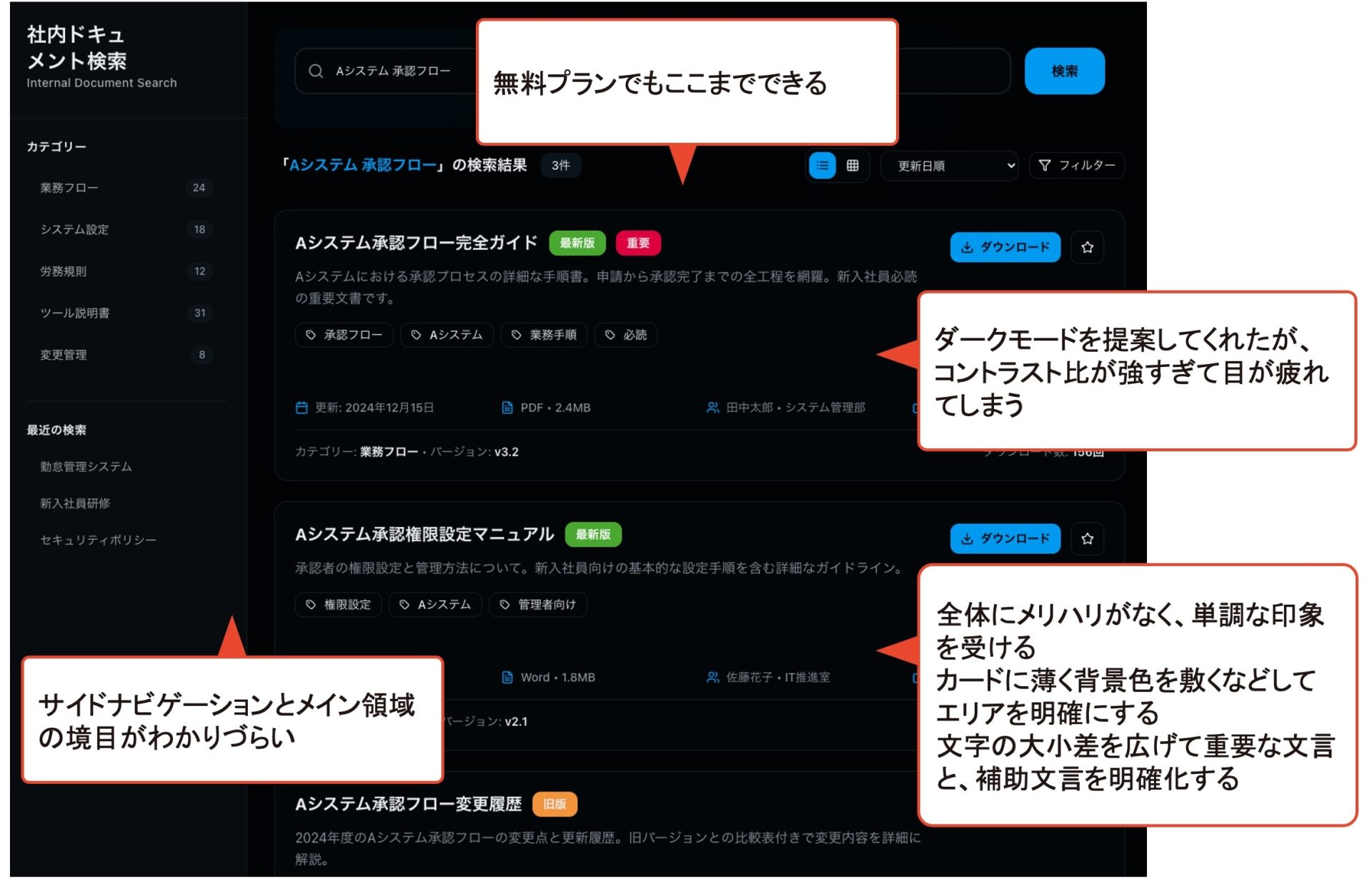 - 境界線がわかりづらい:左側のナビゲーションと、右側のメインエリアの境目が非常にわかりづらいです。ワイヤーフレームの段階ではあったカードの枠も色の差がなくなり、カードの良さが消えてしまっています。