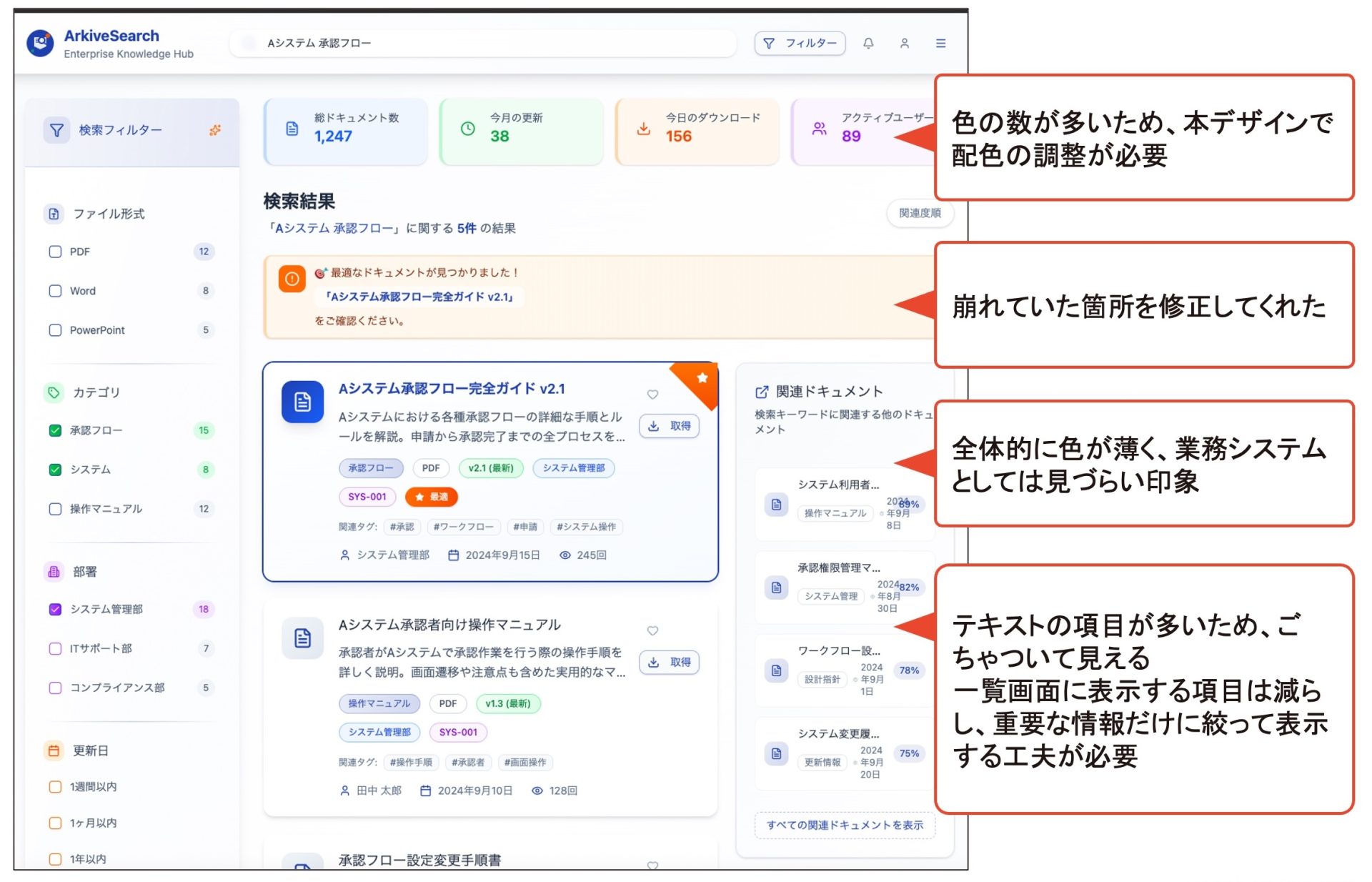 - 修正案:重要なところだけに色をつけ、それ以外は無彩色(白・黒・グレー)にするという配色の調整が必要です。