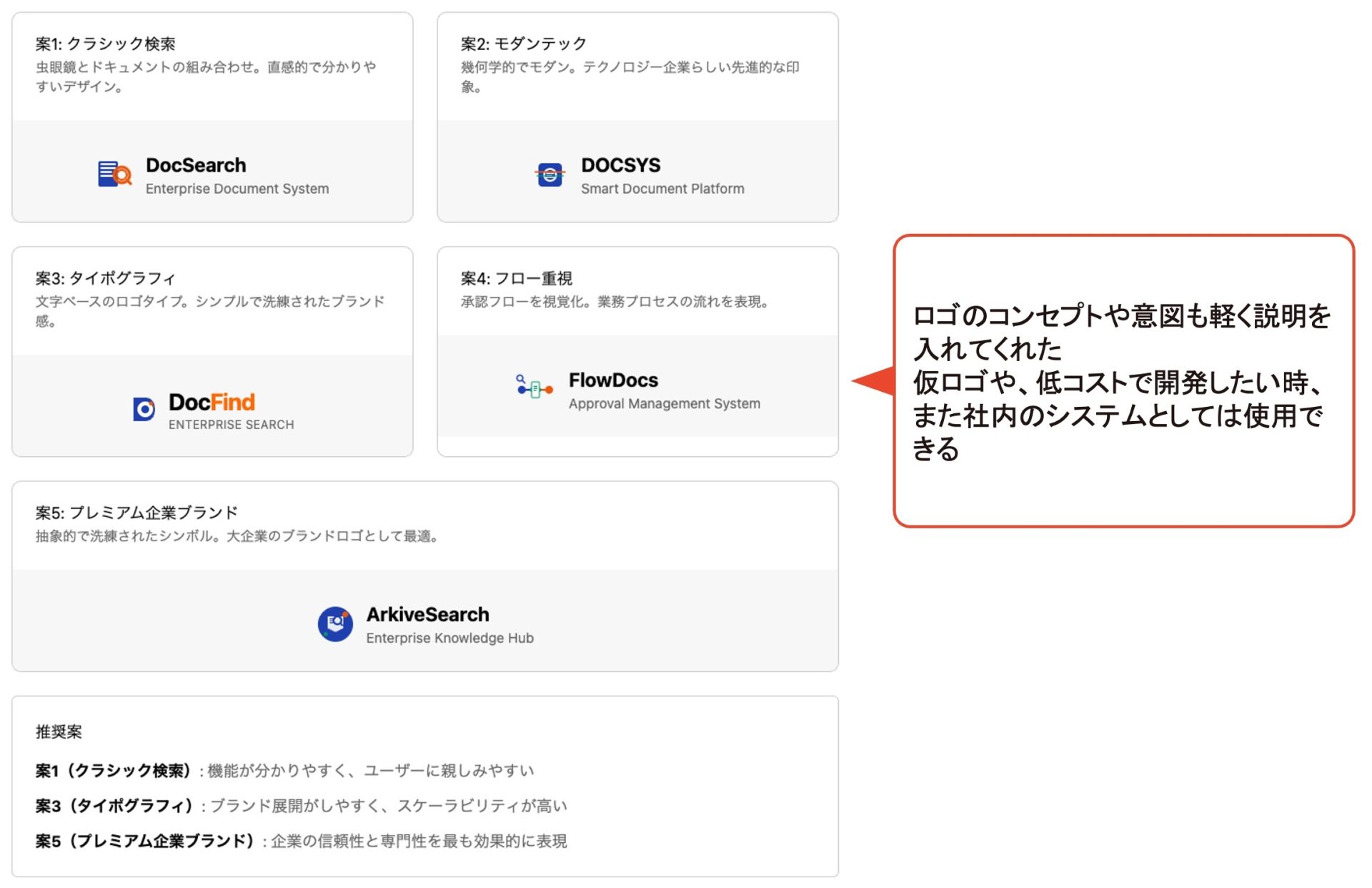 提案されたロゴには、それぞれのデザイン意図やコンセプトの説明も軽く添えられています。