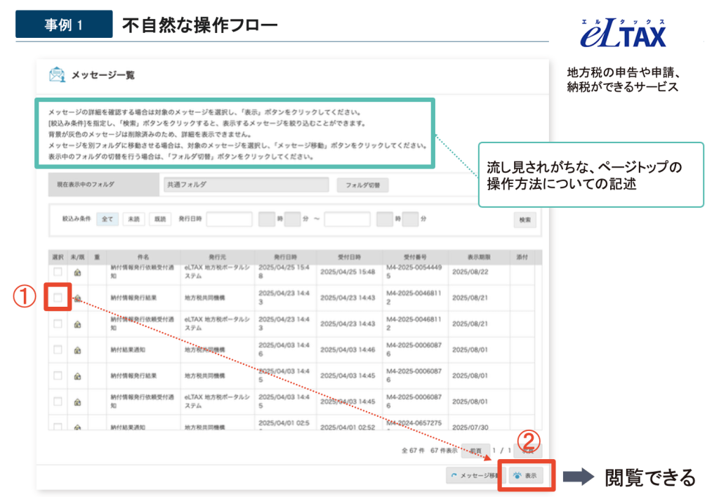 地方税の申告・申請・納税ができるサービス「eLTAX」のメッセージ一覧画面では、閲覧したいメッセージをチェックボックスで選択し、「表示」ボタンをクリックする必要がありました。