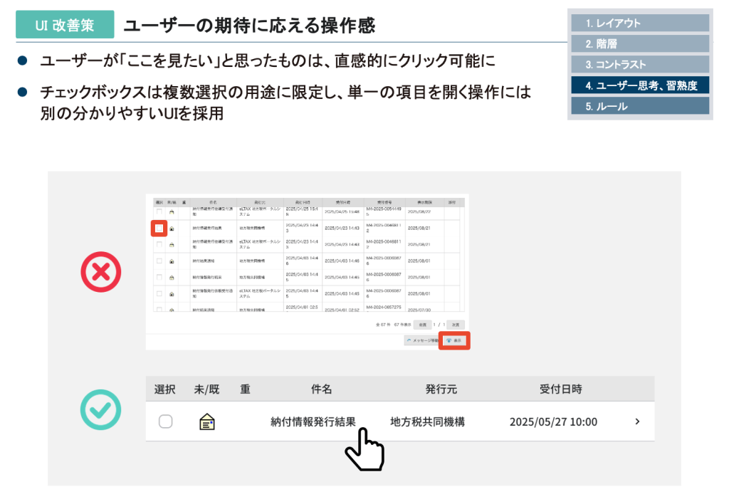 件名をクリックすれば内容が表示されるようにするなど、ユーザーの期待に応える操作感を目指すべきです。