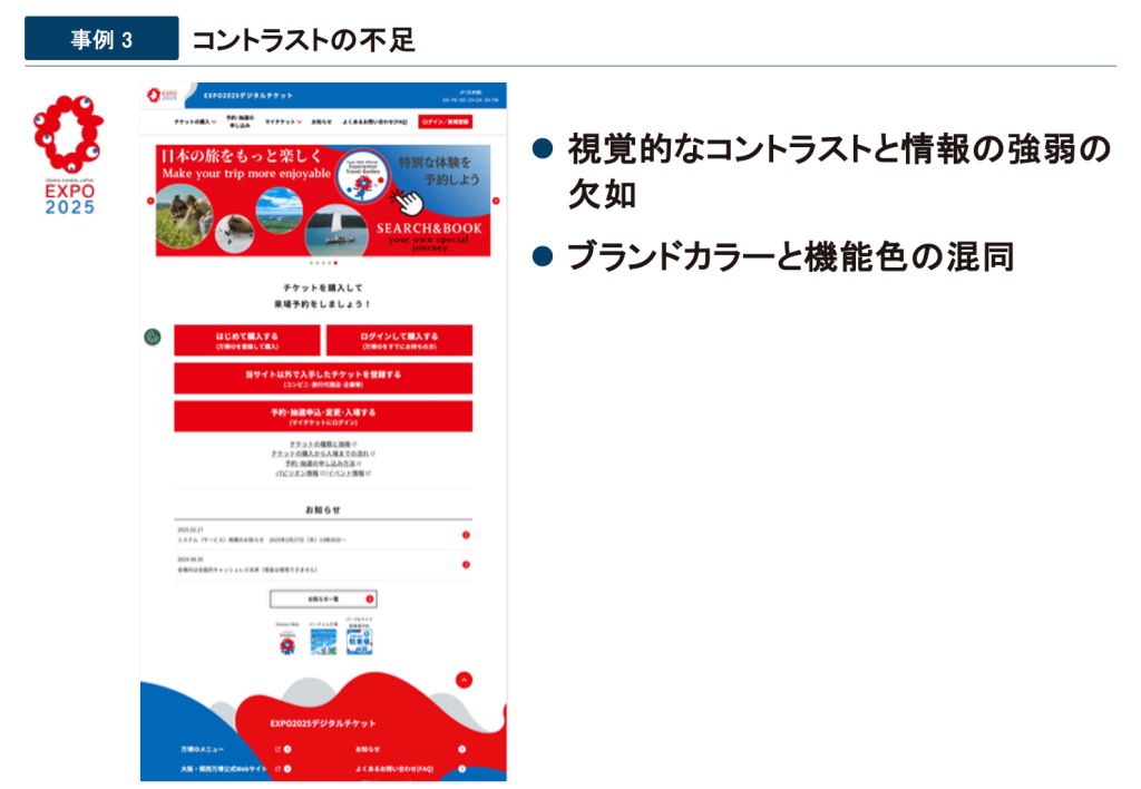 大阪・関西万博チケット購入画面では、ブランドカラーである赤色が多用されており、強調したい情報やアクションを促すボタンとの区別がつきにくいという課題があります。