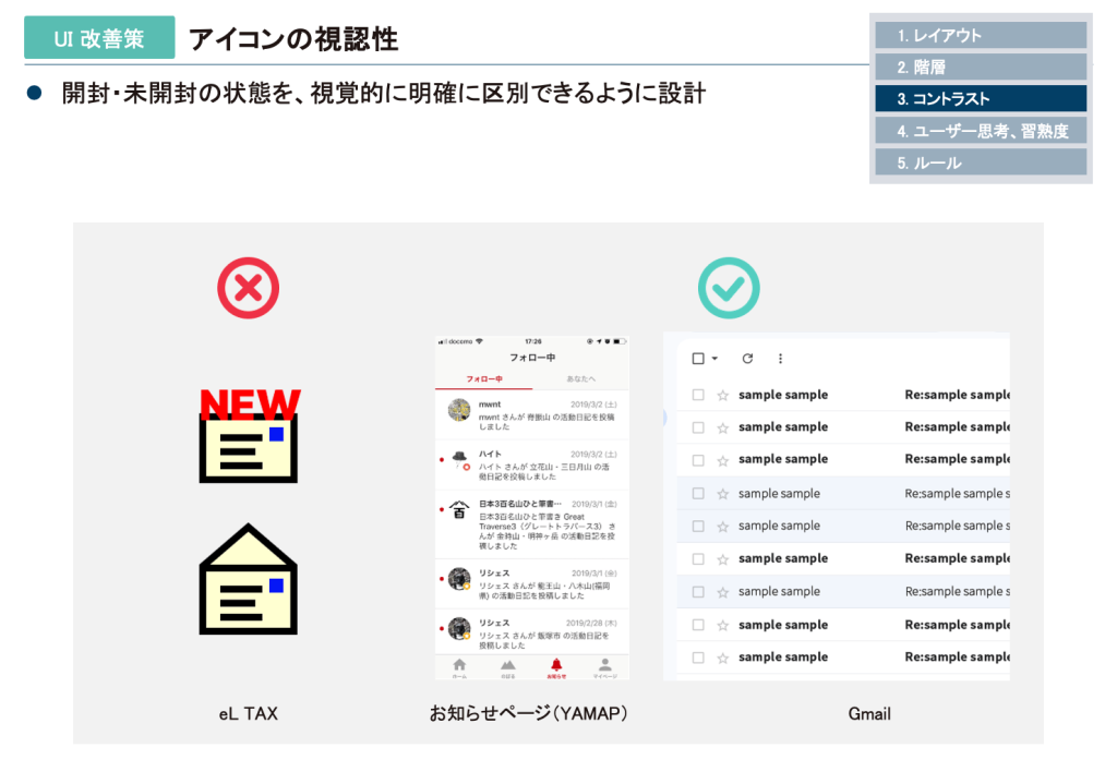 重要な意味を持つ情報は視覚的に明確に区別できるように設計しましょう。小さいアイコンで状態を示すような場合はとくに注意が必要です