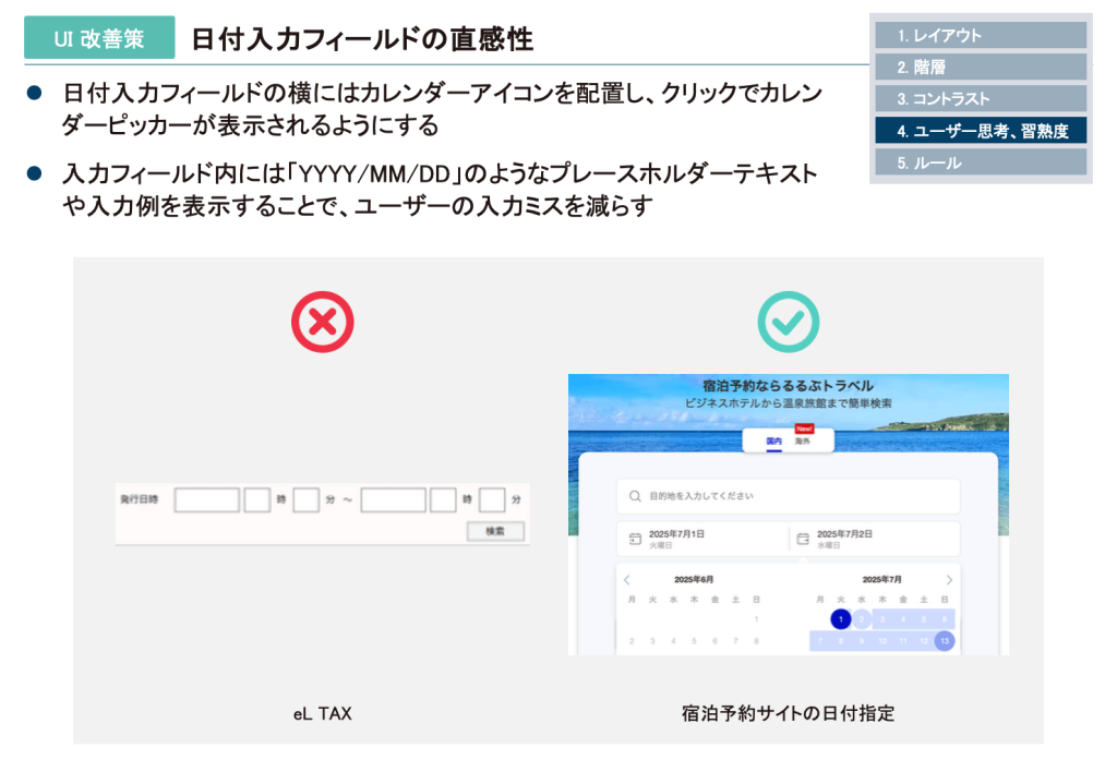 該当ポイント:レイアウト、ユーザー思考、習熟度