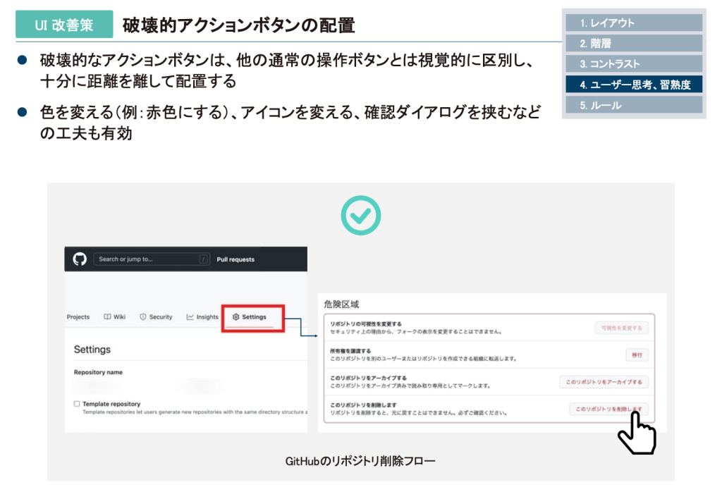 GitHubのように一度実行すると元に戻せない操作には「赤色」や「厳重な確認」が最適であり、Gmailのように一時的な削除で済む場合は、そこまでの強調は不要となります。