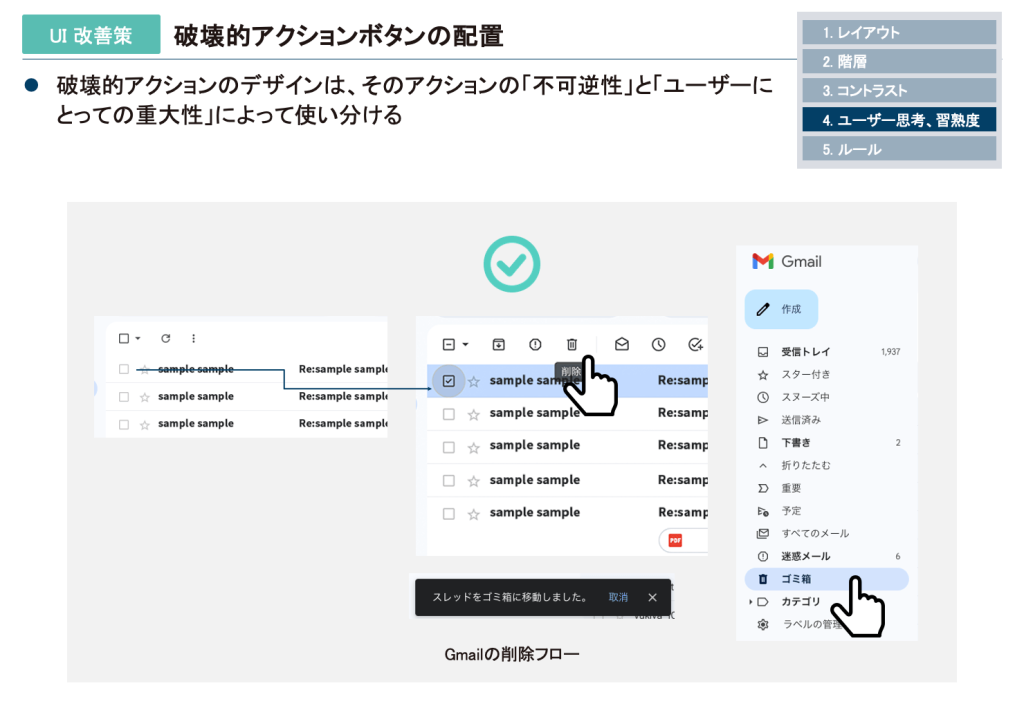 したがって、破壊的アクションのデザインは、そのアクションの 「不可逆性」と「ユーザーにとっての重大性」 によって使い分けることが重要です。