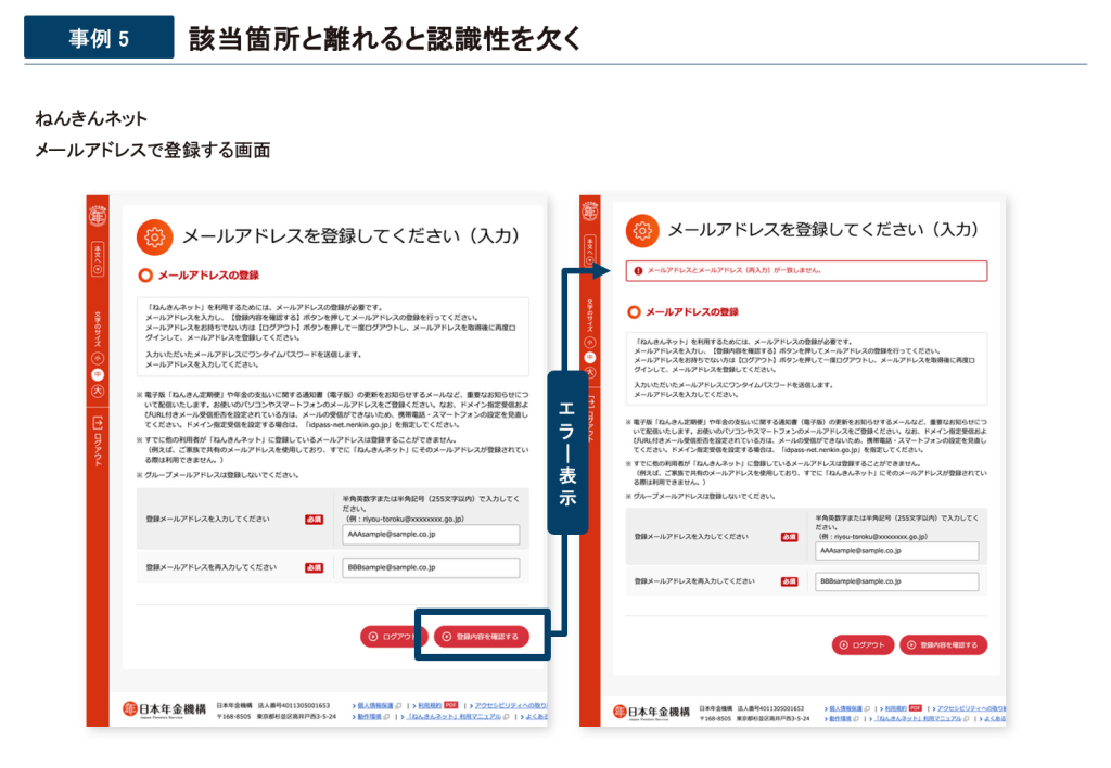 ねんきんネットのメールアドレス登録画面では、エラーメッセージが該当箇所から離れた上部に表示され、具体性に欠けるため、ユーザーがどこを修正すべきか分かりにくいという問題があります。