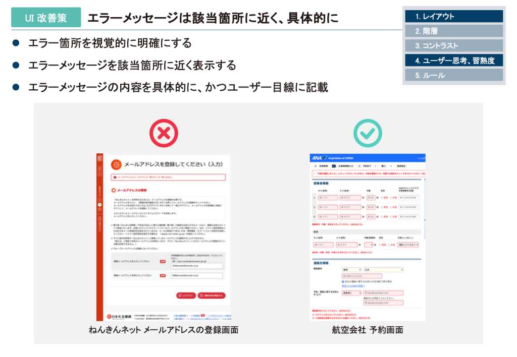 エラーメッセージは、エラー箇所に近く、具体的に表示すべきです。