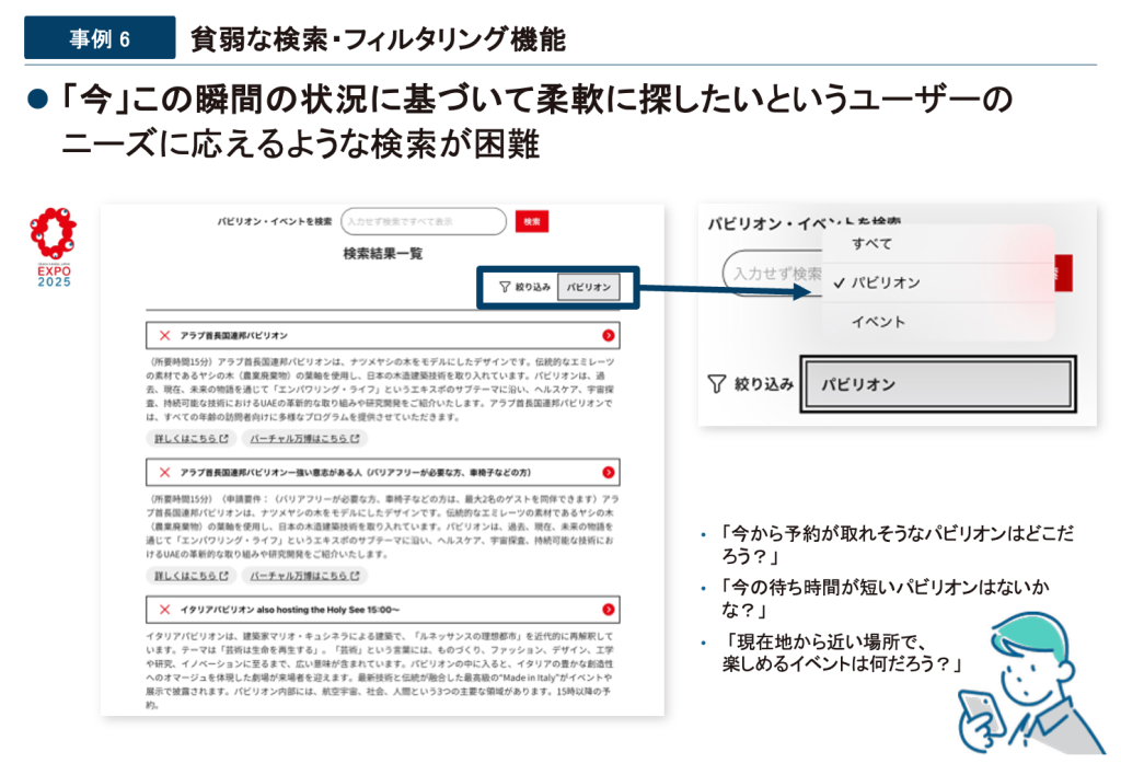 大阪・関西万博のパビリオン・イベント検索サイトでは、「今から予約が取れるパビリオン」や「現在の待ち時間が短いパビリオン」など、ユーザーが「その時々で最も重視する情報」に基づいて柔軟に探したいというニーズに応えられない検索機能が課題として挙げられます。