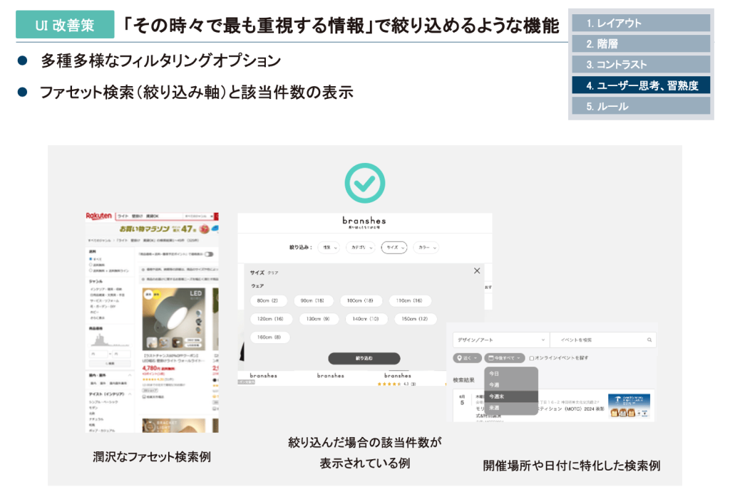ユーザーは多様な検索ニーズを抱えています。ユーザーに欲しい情報が見つからないというストレスを与えないためには多種多様なフィルタリングオプションを提供し、「ファセット検索」(絞り込み軸)と該当件数を表示することで、ユーザーが求める情報に効率的に辿り着けるようにすることが重要です。