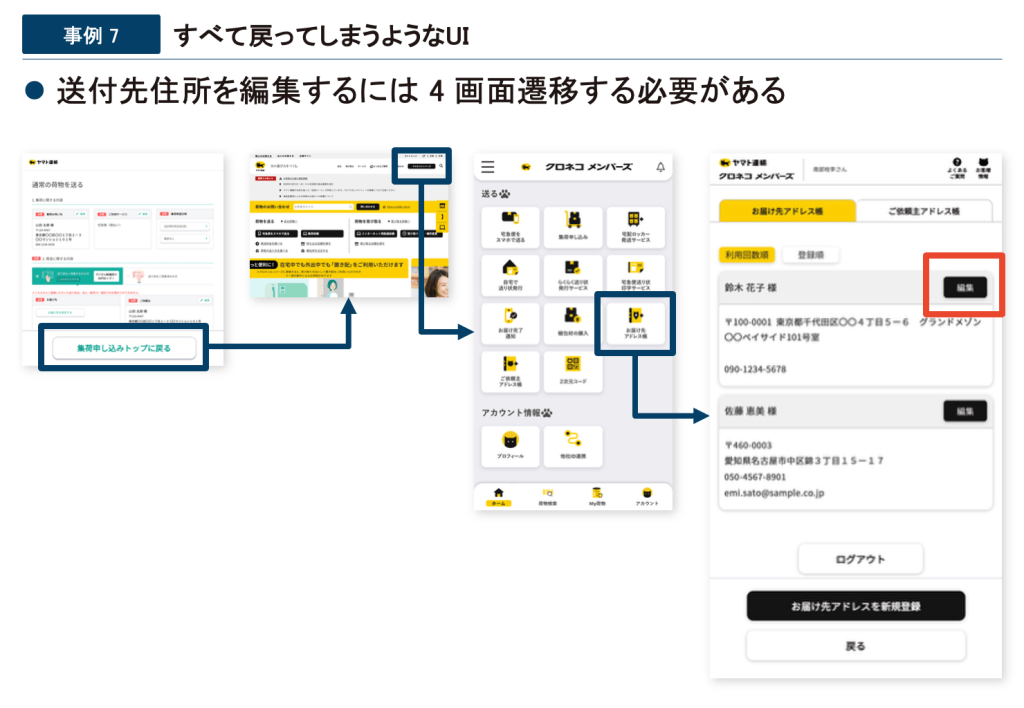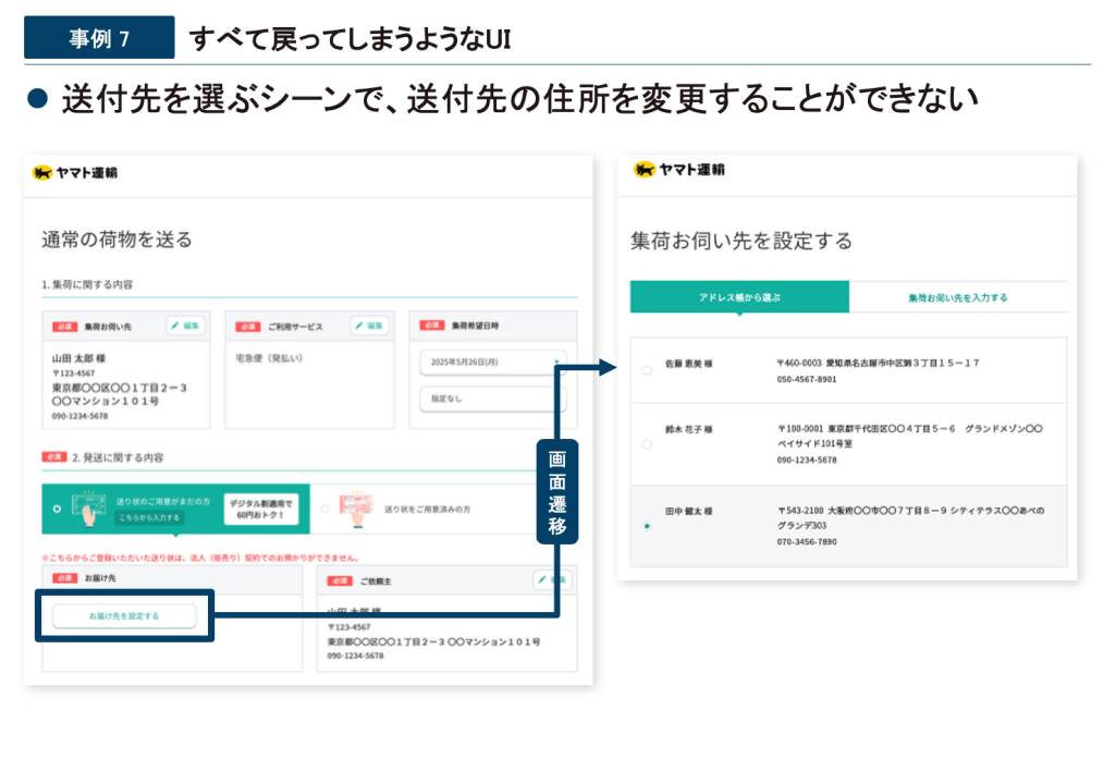 このような設計だと送付先住所を変更するためにユーザーは一度集荷設定をキャンセルし、サービスのトップページに戻り、ユーザー画面からアドレス帳を開いて住所を修正してから、再度集荷依頼の最初からやり直す必要があります。