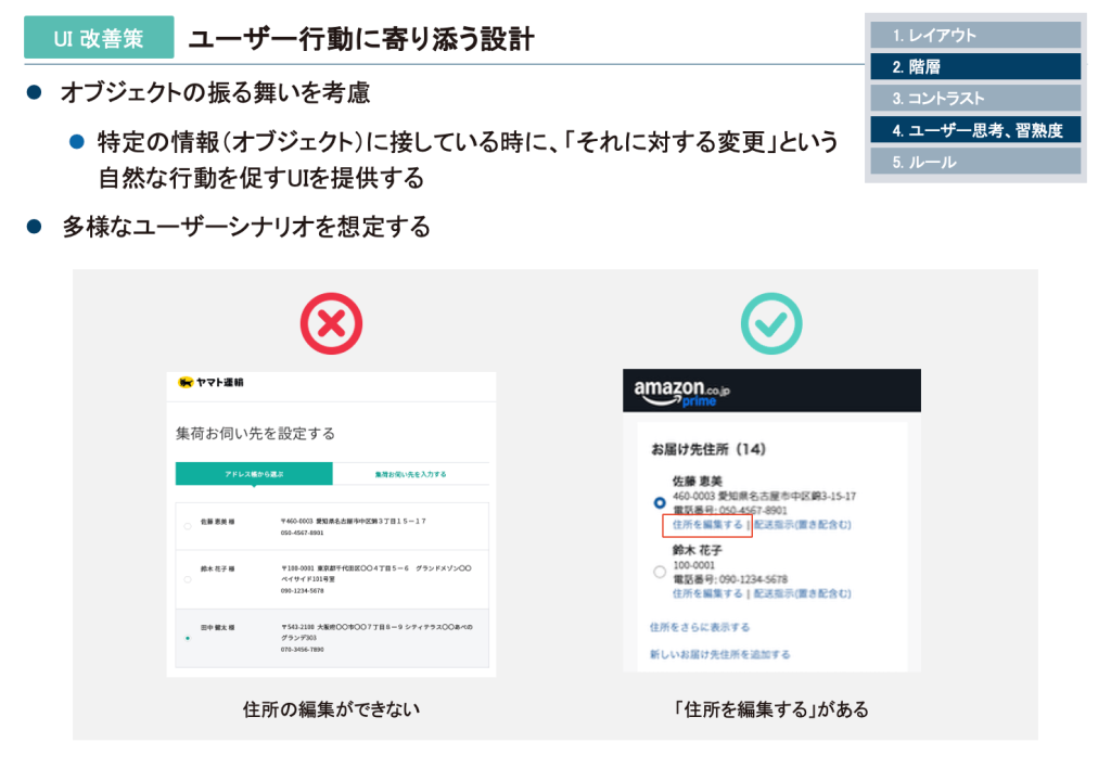 上記の「事例7」で見たように、ユーザーが特定の情報(オブジェクト)に接している時に、「それに対する変更」という自然な行動を促すUIを提供することが、使いやすさの鍵となります。